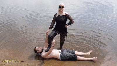 Lady Karame had asked her slave to do certain things for her but he did not. She was not happy with what he had done so she punished him. She took him to the river bank and she waded in water and mud before she used her boots to humiliate him. He was humiliated but it was what he needed to learn his lesson and never mess with her again.